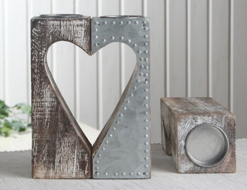 Die Teelichthalter sind von einer Seite nur in Holzoptik, von der anderen Seite ist einer der beiden Halter mit einem Design-Blech verziert. Egal, von welcher Seite Sie ihn betrachten, er ist immer wunderschön. Klicken Sie auf das Bild: wir haben dieses Schmuckstück für Sie von beiden Seiten fotografiert.