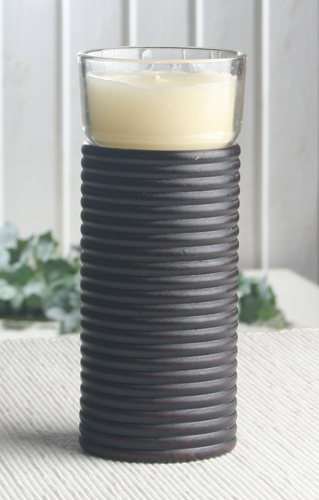Dieses Dekoobjekt besteht aus zwei Teilen – eine braun-gerillte Deko-Säule aus Holz und ein gefülltes Kerzenglas.