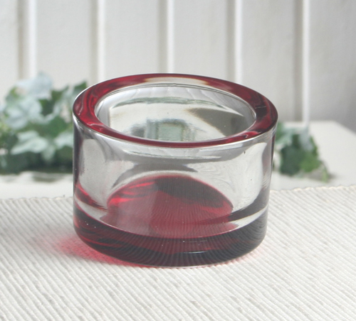 Dieser Kerzenhalter aus dickem, klarem Glas und roter, durchschimmernder Unterseite eignet sich prima für Maxi-Teelichte.
