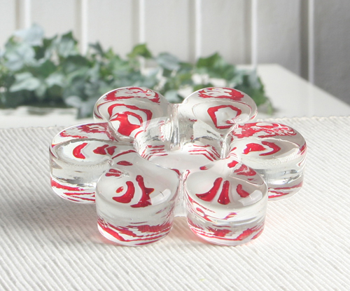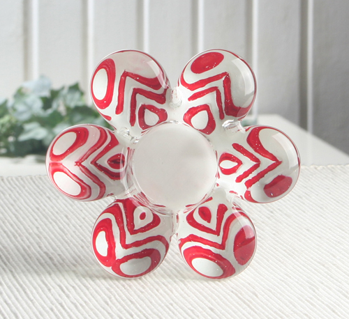 Die rot-weiß bemalte Unterseite schimmert durch das klare Glas hindurch.