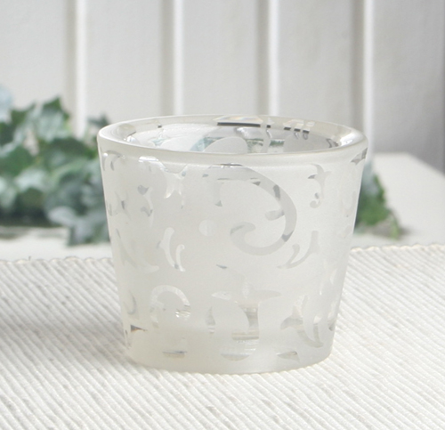 Schöner Teelichthalter aus dickwandigem, gefrostetem Glas mit Ornamenten.