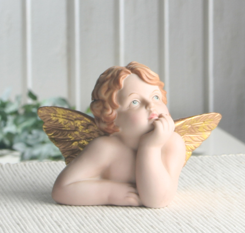 Hübscher Deko-Engel mit verträumten Blick nach oben und Kinn auf seinem aufgestellten Arm.