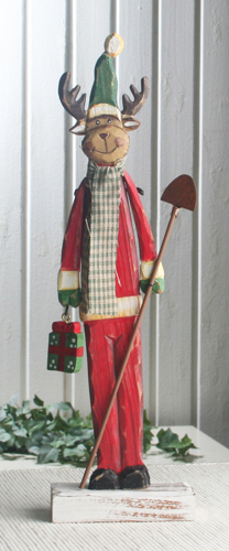 Ein schönes Rentier aus Holz - mit beweglichen Armen und einem Stoffschal um den Hals. Das Rentier trägt ein baumelndes Geschenk in der einen und hält eine "rostige" Schaufel in der anderen Hand.