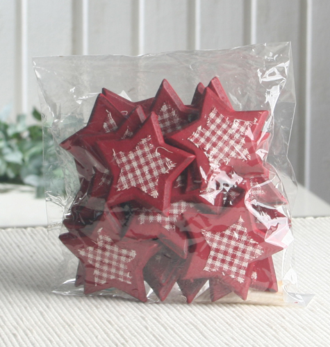 Diese 24 rustikalen Holzsterne mit rot-weiß-kariertem Stoff auf der Vorderseite haben eine Größe von 5 cm Ø und eine Stärke von ca. 0,5 cm.