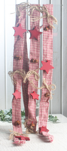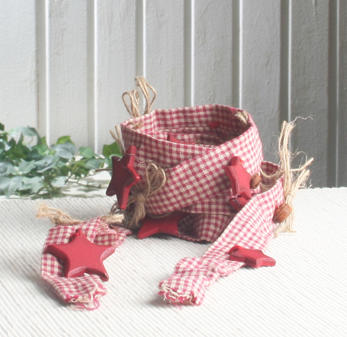 Diese rustikale rot/weiß/karierte Stoffgirlande ist mit insgesamt 10 Sternen (in zwei unterschiedlichen Größen), mit Juteschleifchen und gerosteten Metallglöckchen verziert.