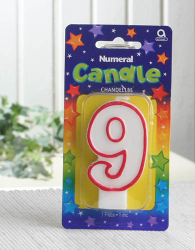 Geburtstagskerze / Zahlenkerze (weiß-rot), ca. 7,5 cm hoch, "9"
