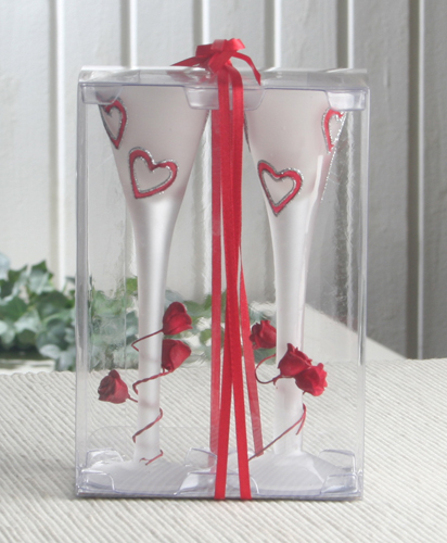 Diese schönen gefrosteten Kerzengläser in Sektglas-Optik sind beidseitig mit funkelnden Herzen bedruckt und von unten mit Deko-Rosen als Zierde umwickelt.