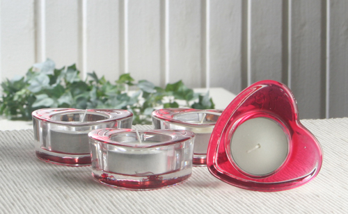 Diese Glas-Teelichthalter in Herzform sind eine perfekte Kombination aus klarem Glas und roter Ober- und Unterseite.