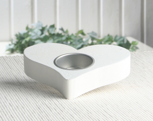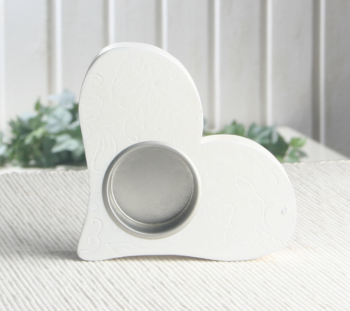 Dieser Teelichthalter in Herzform mit zarten Blumen-Ornamenten auf der Oberfläche eignet sich hervorragend als Dekoration für Hochzeiten, Valentinstag oder als Geschenk für Romantiker und Verliebte.