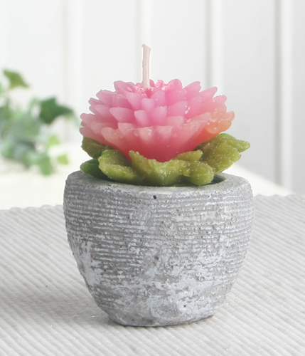 Die Kerze ist aus Kerzenwachs (Paraffin), der graue und rustikal gearbeitete Blumentopf ist aus dem Kunststein Polyresin.