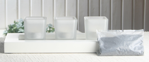 Dieses schöne Deko-Set besteht aus einem länglichen, hochwertigen Holztablett in weiß, 3 gefrosteten, eckigen Kerzengläsern sowie Teelichten und einem kleinen Beutel mit grauem Zierkies.