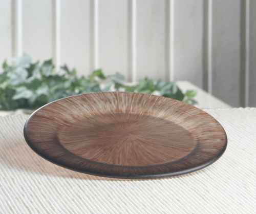 Schöner glatter Glasteller für Ihre Dekoration aller Art. Optisch wie mit braunen Pinselstrichen (Brush-Art-Design) bemalt.