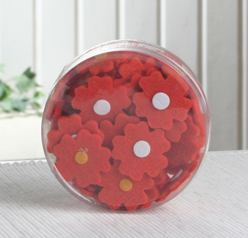 48 farbige kleine Blüten aus Filz. Nette, farbenfrohe Streudeko für den gedeckten Tisch. In der Mitte der Blüte ist ein kleiner Farbpunkt, der die Blüte etwas auflockert.