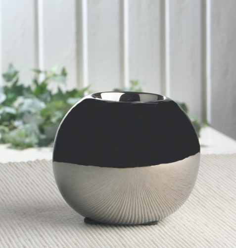 Dieser minimalistische Teelichthalter aus Keramik mit verchromter, glänzender Oberfläche und bauchiger Form, wirkt sehr edel auf einem hübsch gedeckten Tisch. Auch als nette Dekoration auf einer Anrichte, Kommode oder Regal platziert, macht er eine gute Form und lässt sich toll in Szene setzen.