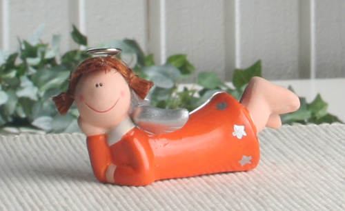 Engel-Mädchen "Marie" lächelt breit über das ganze Gesicht und versprüht damit gute Laune in der Winterzeit. Sie wird liegend dargestellt.