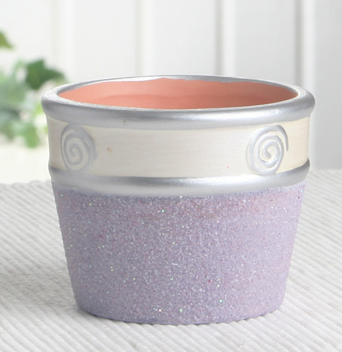 Material: Keramiktöpfchen, flieder und silber lackiert