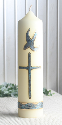 Schöne Taufkerze mit Wachsverzierungen in 3D-Optik. Die Verzierungen sind gold und blau marmoriert.