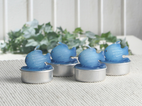 Schöne Deko-Teelichter in Form eines detailgetreu bemalten Fisches auf Meereswellen.