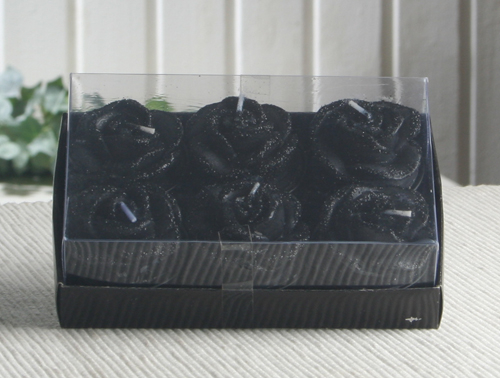 Eine wunderschöne glitzernde, schwarze Rosenblüte ziert dieses Teelicht in der Aluhülle.