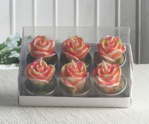 Eine wunderschöne orange-pinkfarbene Rosenblüte ziert dieses Teelicht in der Aluhülle.