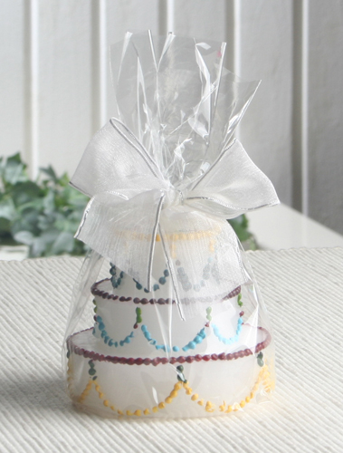 Hochwertig gestaltete Dekokerze in Form einer "leckeren" 3-stöckigen Geburtstagstorte mit "Happy Birthday"-Schriftzug auf der Oberseite.