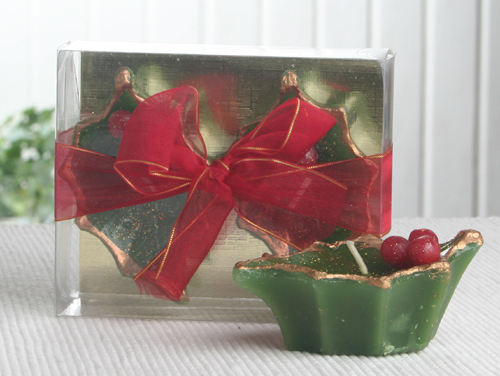 Eine festliche Dekokerze in der Form eines grünen Blattes mit roten Beeren und golden glitzernder Dekoration, Schön für Ihre weihnachtlichen Dekoideen und mit der wertigen Verpackung mit Schleife auch ein nettes kleines Geschenk, Die Maße der Kerze betragen ca. 30 mm Höhe und ein Durchmesser von ca. 80 x 50 mm, Lassen Sie Dekoteelichter bitte immer nur auf feuerfesten Untersetzern abbrennen.