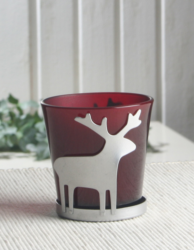 Schönes dunkelrotes Teelichtglas in einer silbernen Halterung mit Elch-Motiven.