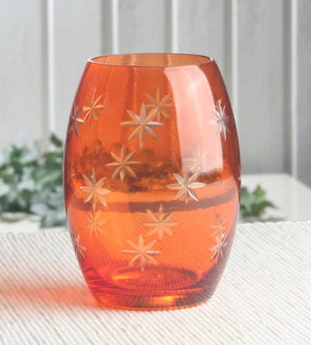 Dieses bauchige Teelicht/Windlicht aus orangefarbenem Glas sorgt für einen ganz besonderen Touch. Durch die eingeschliffenen Sterne erzeugt das Kerzenlicht hübsche Lichteffekte.