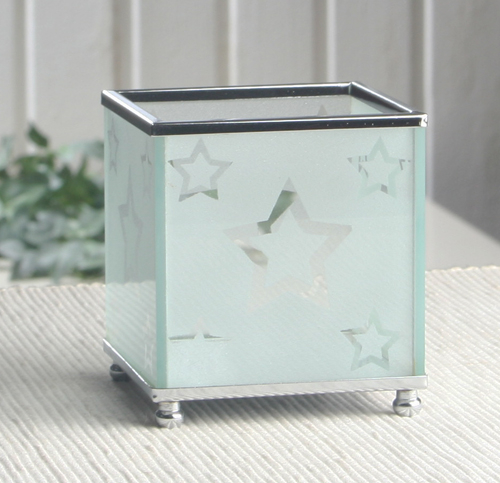 Dieser quadratische Würfel-Kerzenhalter aus Milchglas, mit kleinen silbernen Plastik-Standfüßchen und Boden-Spiegelplatte im Inneren, sorgt mit einem (Maxi)Teelicht für ein stimmungsvolles Licht und bringt das klare Sternen-Motiv zum strahlen.